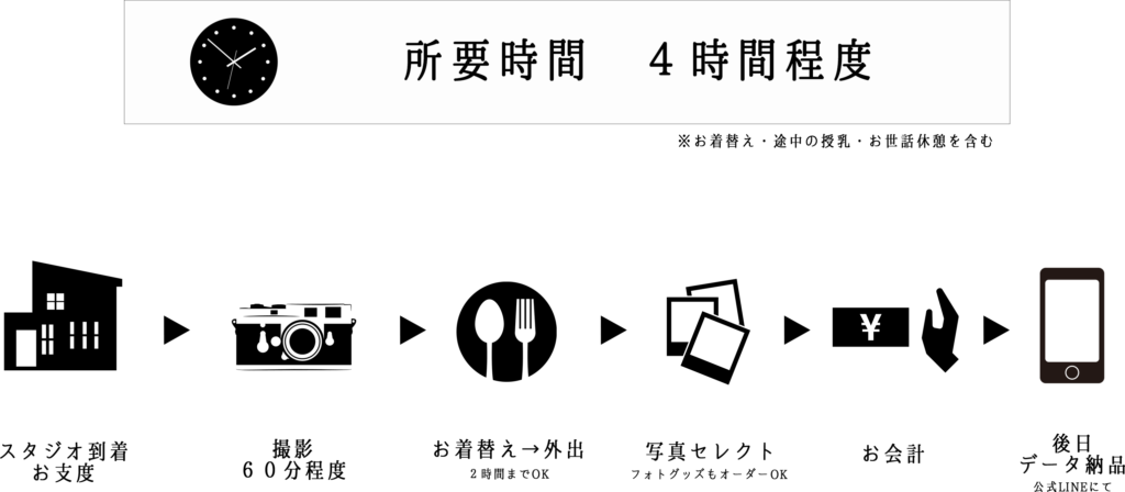お支度、撮影項目、ご来店人数に応じて、所要時間が異なります